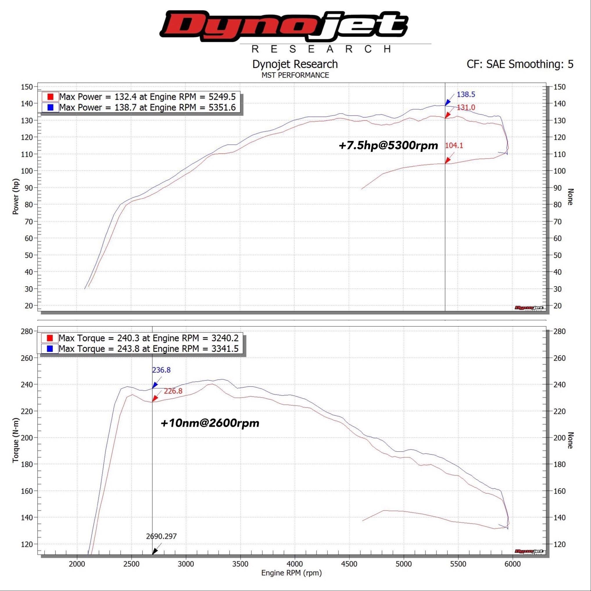 * Dyno result: Max gains +7.5hp@5300rpm +10nm@2600rpm